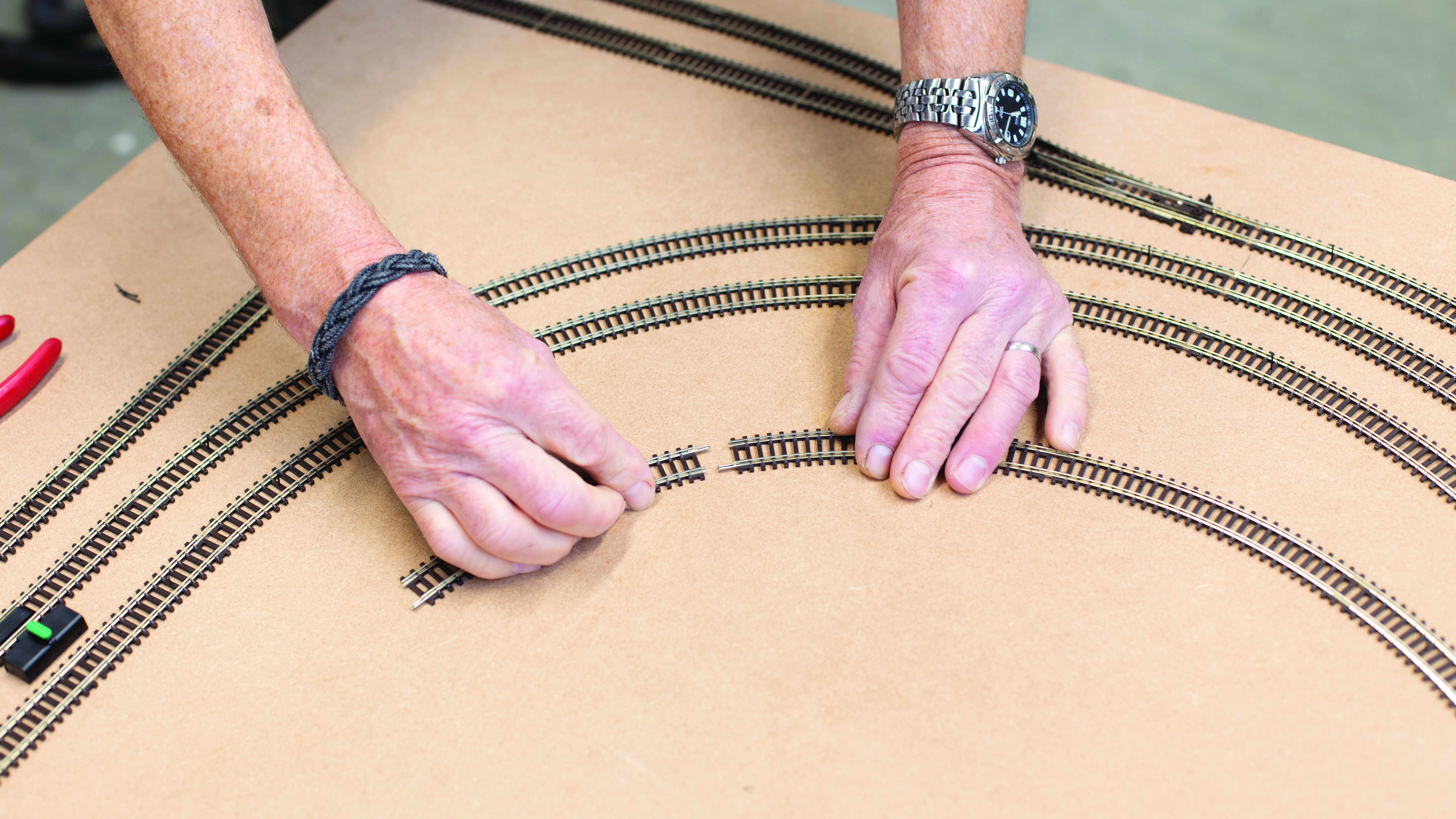 Track pins go through the holes in the sleepers, but you need to work very gently to avoid bending or breaking the pin. Using long nose pliers and a hammer to get the pin most of the way is a good idea, and then finish the job with a pin pusher, ensuring it is flush with the sleeper. You don’t need to put a pin in every hole, but a few strategically placed pins will do the job.
