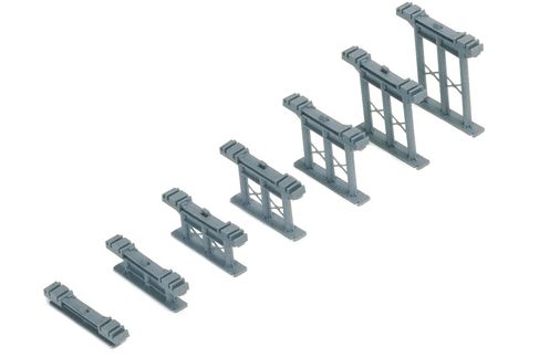 These High Level Piers provide essential support for elevated track sections on OO gauge layouts. Supplied as a pack of three grey supports, they allow for impressive height variations of up to 80mm. When positioned at 24 sleeper intervals, they create a running length of approximately 1344mm, while spacing at 30 sleeper intervals extends this to 1680mm for more gradual inclines. Designed with integrated grooves compatible with R660 Elevated Track Sidewalls, these piers offer modellers flexibility when creating dynamic multi-level railway scenes.