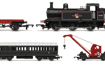 The new analogue train set includes the BR 0-6-0 Class 3F locomotive, Operating Crane Truck, Conflat wagon / Match Truck and Engineering Department Coach.